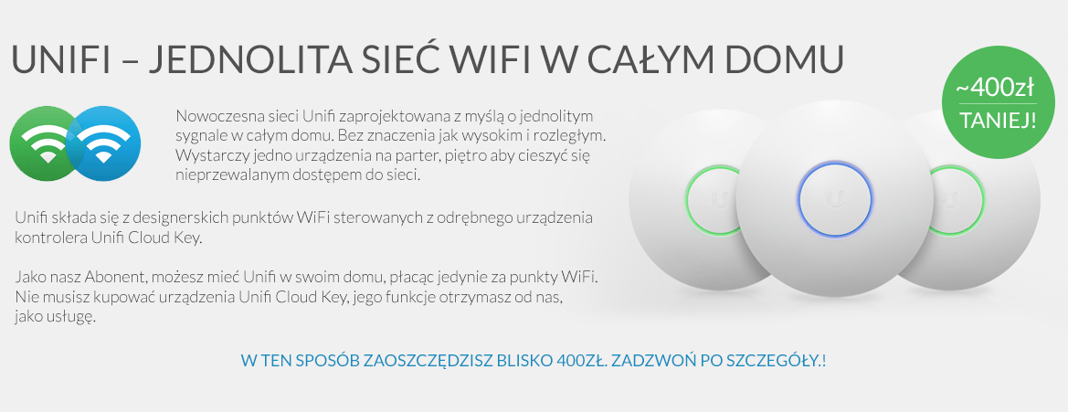 Nowoczesny, szybki internet w stałej miesięcznej cenie. Siedem dni darmowego testu “bez haczyków”! Nie wymagamy lini telefonicznej. Kupując wybrany pakiet abonamentowy, otrzymasz nowoczesny router Ubiquiti wliczony w cenę aktywacji. Gotowy do działania. Podłącz do prądu i korzystaj! Współpracuje z większością domowych routerów WiFi. Zapewni dostęp do internetu urządzeniom: MS Windows, Linux, Apple iOS, Android, Sony PSX, Microsoft Xbox, NC+, Polsat oraz technologii Smart TV Sprawdzony z usługami HBO GO, HBO on Demand, NC+ VOD, YouTube. Wygodny, samodzielny montaż lub opcjonalny montaż przez serwisanta. Unifi – jednolita sieć Wifi w całym domu. Nowoczesna sieci Unifi zaprojektowana z myślą o jednolitym sygnale w całym domu. Bez znaczenia jak wysokim i rozległym. Wystarczy po jednym urządzeniu na parter i każde piętro, aby cieszyć się ciągłym i nieprzerwanym dostępem do sieci. Unifi składa się z designerskich punktów WiFi sterowanych z odrębnego urządzenia kontrolera Unifi Cloud Key. Jako nasz Abonent, możesz mieć Unifi w swoim domu, płacąc jedynie za punkty WiFi. Nie musisz kupować urządzenia Unifi Cloud Key, jego funkcje otrzymasz od nas, jako usługę.